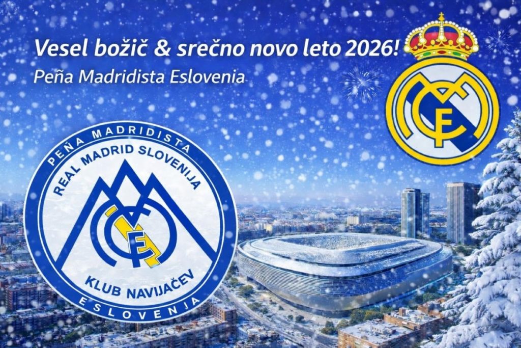 Članice in člani Kluba navijačev Real Madrid Slovenija – Peña Madridista Eslovenia, navijačice in navijači Real Madrida, želimo vam vesel božič in srečno novo leto 2026! Klub navijačev Real Madrid Slovenija – Peña Madridista Eslovenia